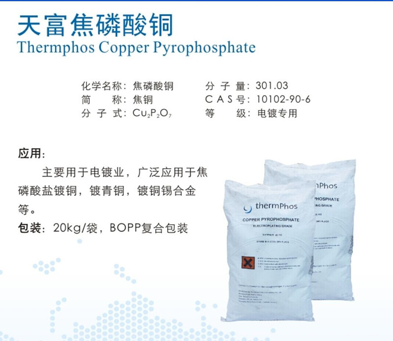 簡介:天富焦磷酸銅,主要用于電鍍業(yè),廣泛應(yīng)用于焦磷酸鹽鍍銅,鍍青銅,鍍銅錫合金等。